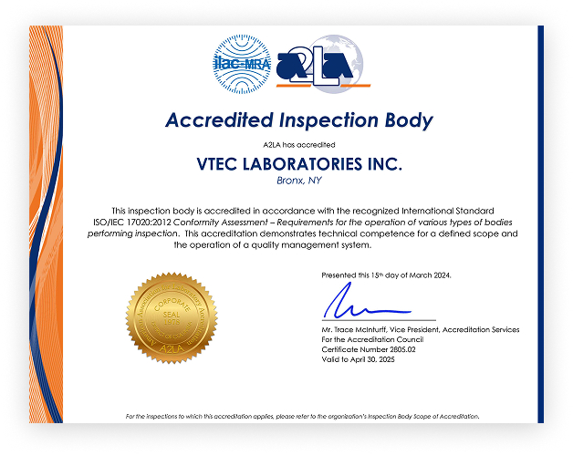 VTEC Laboratories holds multiple prestigious accreditations, including ISO 17020, ISO 17025, and ISO 17065. We are also an approved vendor for NYC DOT, NYC Transit Authority, and The Port Authority of NY & NJ. Our credentials reflect our commitment to delivering accurate, high-quality inspection services.
